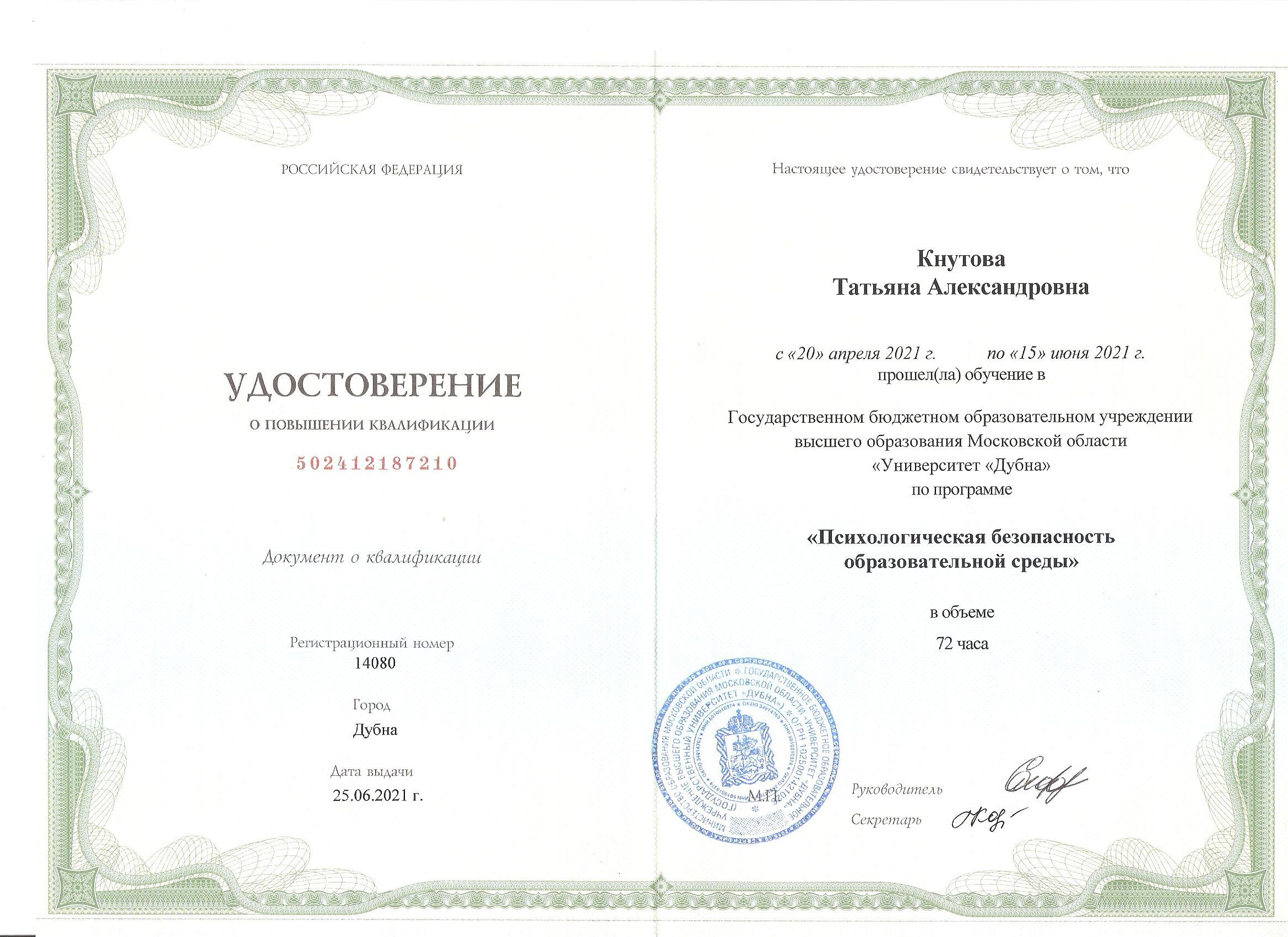 «Психологическая безопасность образовательной среды», 72ч., 2021г.